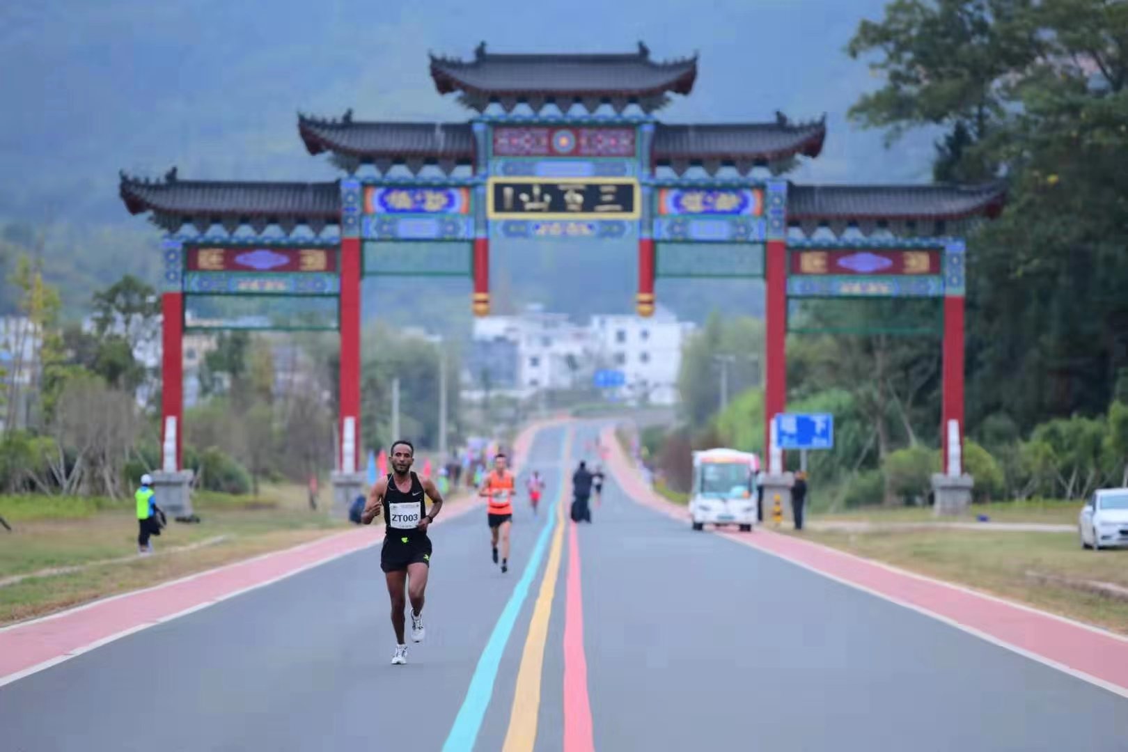比賽中選手們矯健的身姿和挑戰自我的體育精神吸引了沿途近萬名熱情的當地百姓,學校師生、社會團體,他們用最熱情的呼喊為參賽選手們加油助威,三百山景區的彩虹賽道延伸着一條靚麗的選手風景線——安遠,瞬間被馬拉松點燃,展示出新時代下安遠的建設風貌。