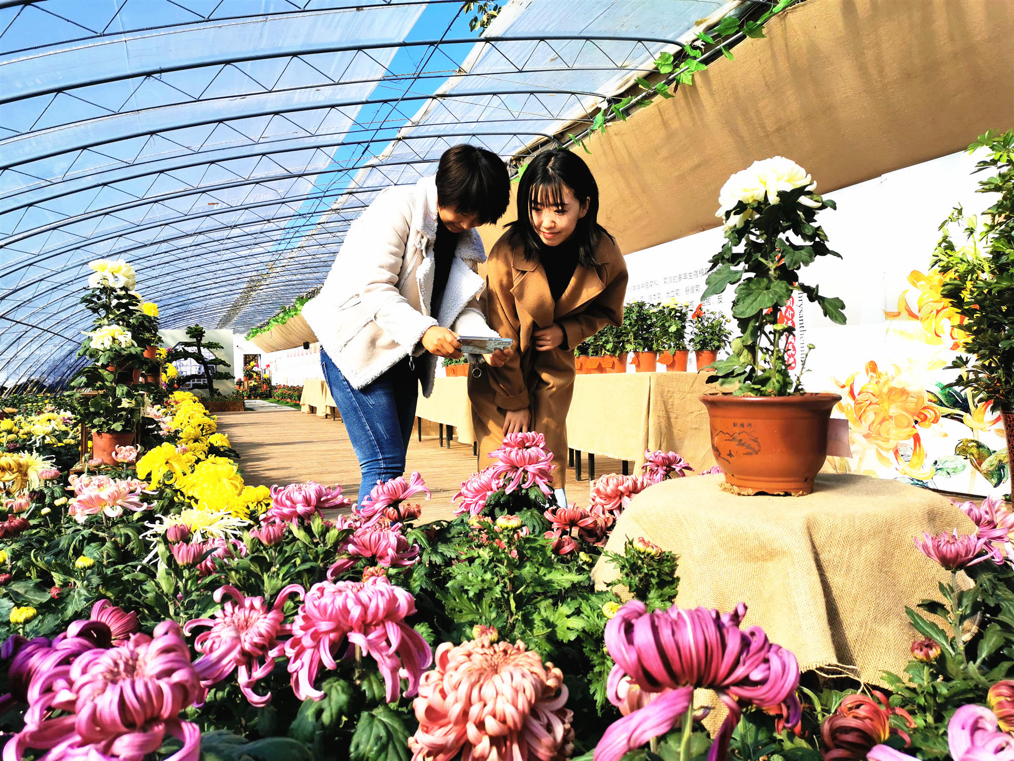 平谷區大興庄鎮西柏店村是全國最大的食用菊生產基地,圖為食用菊生產基地菊花盛放、花開迎客