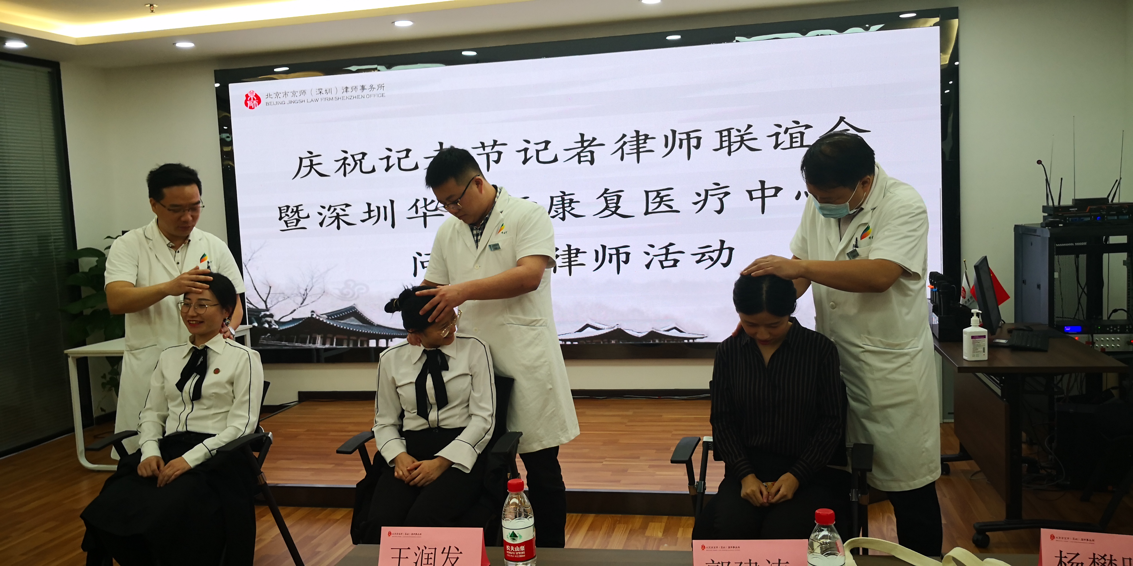 【香港商報網訊】記者 蘇偉 報導:11月7日下午,在記者節前夕,深圳華醫行康復醫療中心專業醫生來到深圳廣電集團文創中心的京師〈深圳)律師事務所慰問辛勞在一線的記錄和律師們。因為工作關係,記者律師長期伏案工作,患頸椎和肩周炎的較多。醫療中心的專業醫生對30多位記者和律師進了理療服務並講解了防護的專業知識,受到了記者和律師的歡迎。