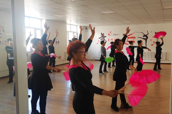 麻山區城鎮助老活動中心,舞蹈室里正在跳舞的老年舞蹈隊。楊雪楠 攝