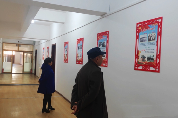 麻山區城鎮助老活動中心,老人在走廊上閱讀黨建宣傳內容。楊雪楠 攝