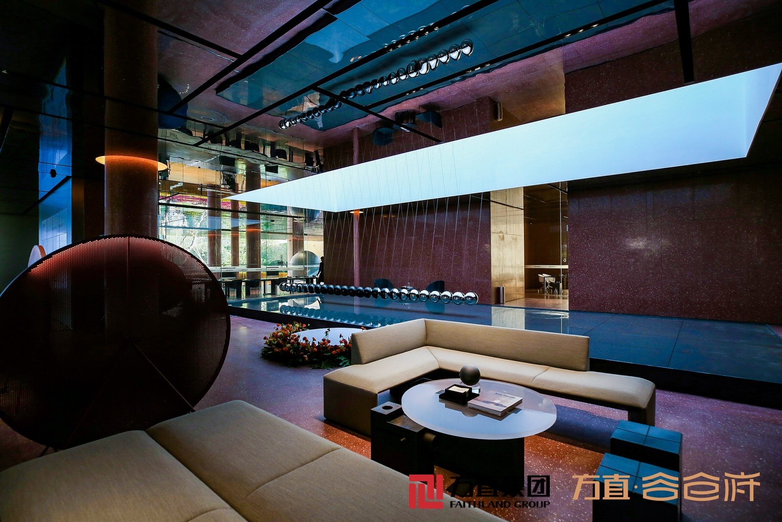 洽談區與中庭區獨具一格的裝飾,空間整體多變與豐富的層次,新穎質感的材料運用,長條桌、洽談桌椅看似無序而有序的擺放裝置藝術品的穿插,賦予空間當代與藝術的內涵,仿佛有置身於圖書館、咖啡吧還是休閒餐廳的錯覺。中庭區的裝飾則是用牛頓擺球裝置的形式詮釋24月滿的自然規律,帶來一個動靜結合與現代藝術和融一體的美學空間,讓在場的每個人都讚歎不已,這就是一個極具鑒賞價值的精美藝術品。