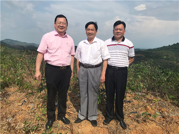 廣東河源紫金縣敬梓鎮田頭村的牛大力種植基地,左起分別為:深圳松樂生物有限公司產學研總監李三斌、廣東霖善堂生物科技有限公司創辦人黃作霖、廣東霖善堂生物科技有限公司董事長黃金水