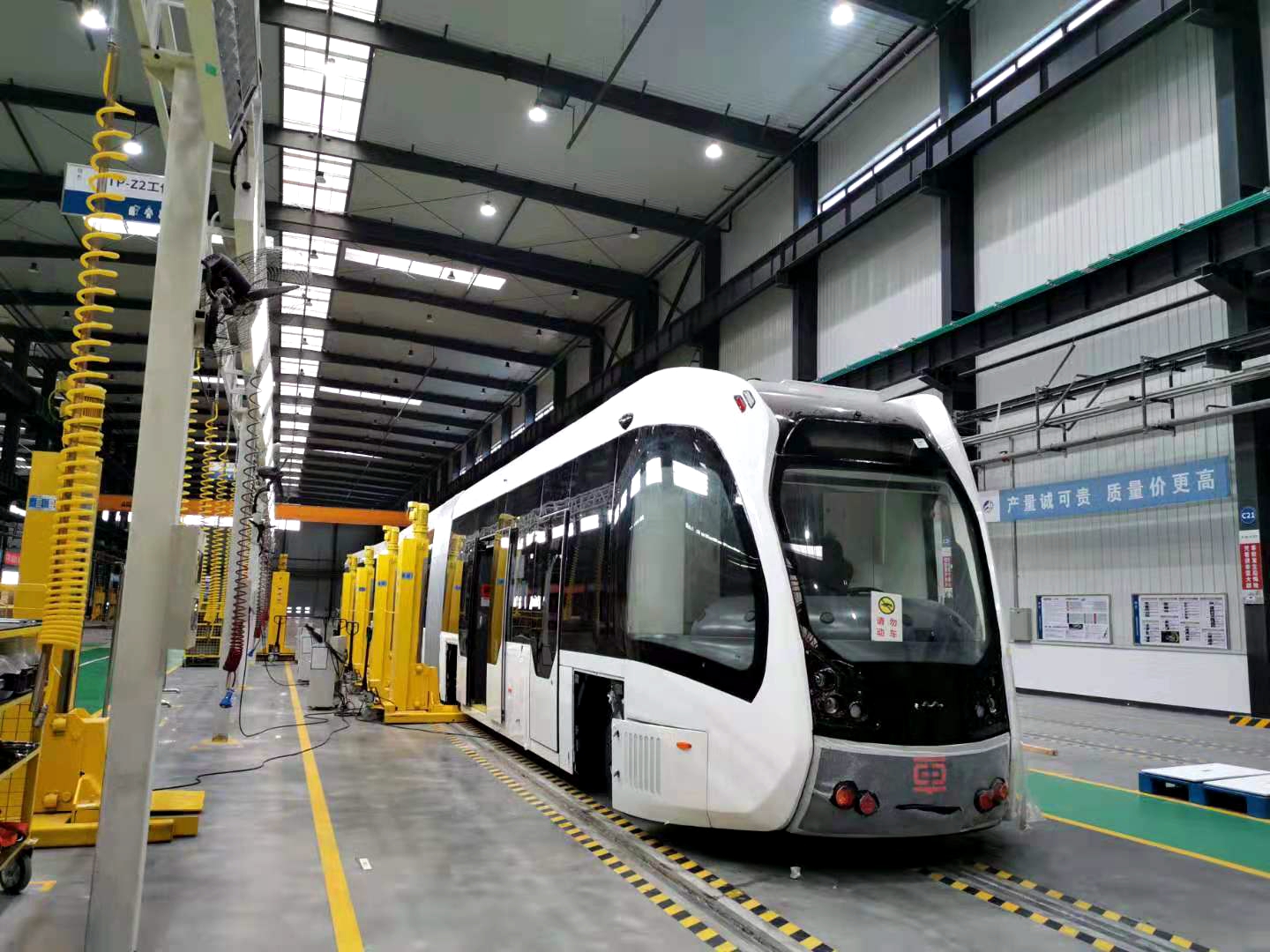 20日上午,記者在宜賓市軌道交通產業基地看到,一輛嶄新的白色智軌電車已組裝完畢,工程師們正在車內進行整車線束校正。