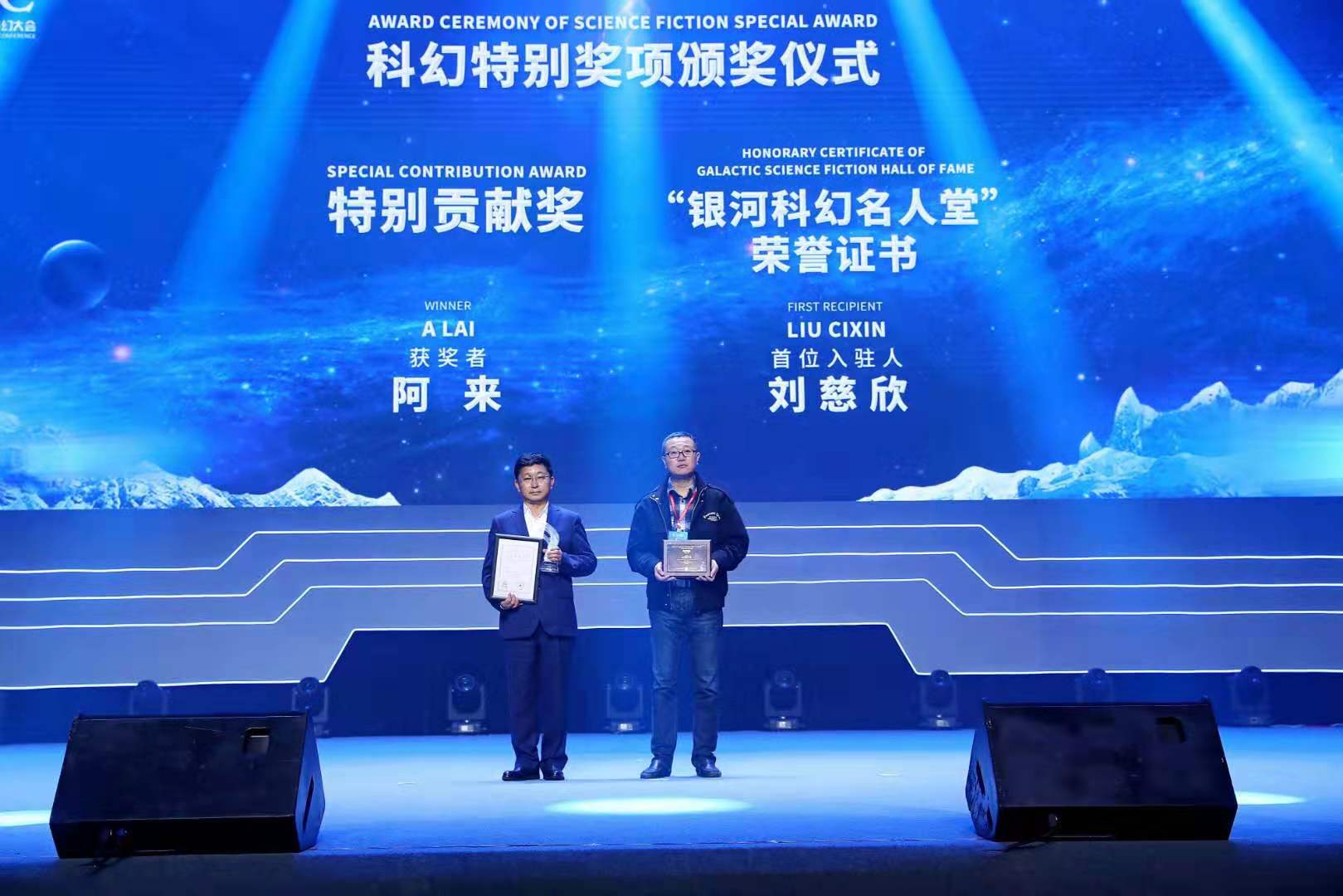 開幕式上,舉行了科幻特別獎頒獎儀式。四川省作協主席、茅盾文學獎得主、《科幻世界》雜誌前主編阿來,獲得「銀河獎」特別貢獻獎。著名科幻作家、雨果獎得主劉慈欣獲得「銀河科幻名人堂」榮譽證書,成為首位入駐的科幻名人。