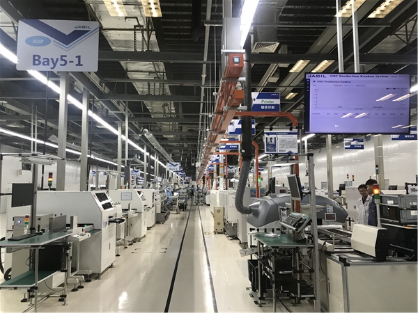 捷普電子(無錫)有限公司生產車間內成列排開的智能生產設備持續運轉着,生產線上着裝統一的技術工人有條不紊地進行生產