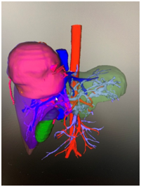 為了給韋先生爭取生存的機會,車旭主任帶領團隊首先利用三維重建技術進行模擬手術切除,多次試驗發現若實行胸腹聯合切口肝中葉切除,仍可精準保留殘肝體積,有根治性切除腫瘤的可能。