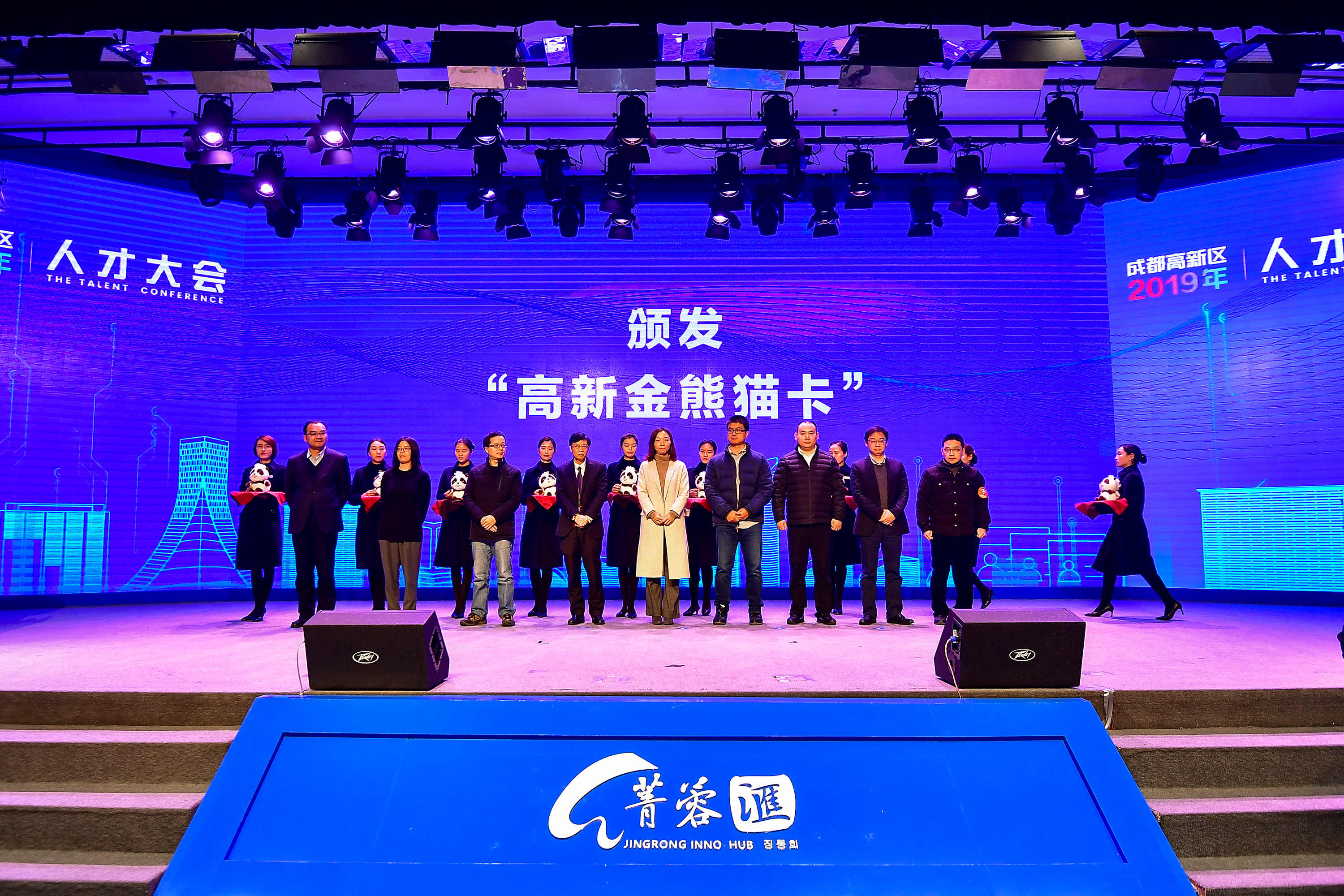 在人才大會上,成都高新區為經認定的首批A、B、C三類共16位人才代表現場頒發「高新金熊貓卡」。