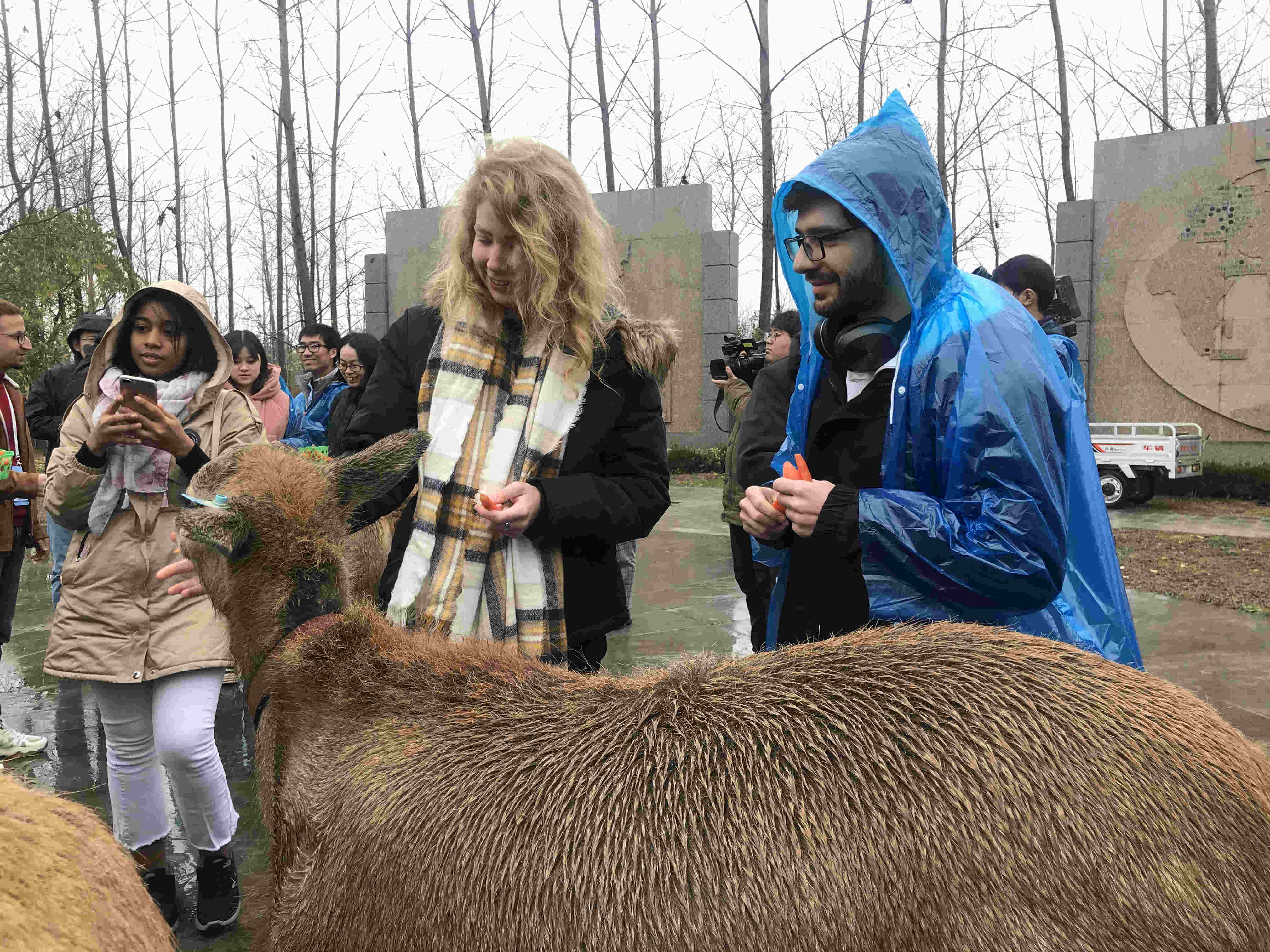 位於鹽城市大豐區的麋鹿國家級自然保護區現生活着五千餘頭麋鹿,其中野生麋鹿1350頭,世界上60%的麋鹿集中於此。作為國家一級保護動物,這一中華物種曾在海外漂泊百年,又幾度瀕臨滅絕,1986年四十餘頭麋鹿從英國輾轉回到大豐,這裡優良的灘涂原生境為這群「濕地精靈」提供了極佳的生息繁衍之地,亦成為中華麋鹿的回歸之地、復興之地。在大豐麋鹿國家級自然保護區內,外籍友人們通過投食胡蘿蔔與小麋鹿們進行了近距離的親密接觸。