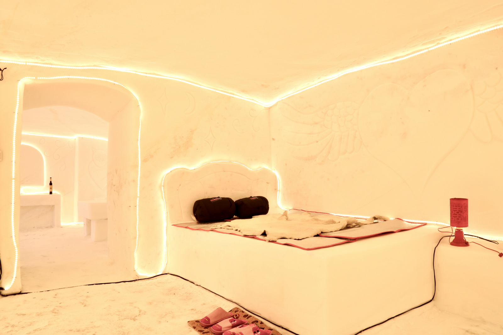 漠河素有「神州北極」的美譽,每年冰雪期長達八個月之久,年均氣溫-5℃左右,冬季極端低溫-50℃。獨特資源優勢,讓冰雪旅館成為這裡獨有的特色住宿場所。旅館內所有的硬件設施都是冰和雪做成,室內保持零下5攝氏度左右的溫度。寒冰床、雪沙發以及雪做的酒櫃、電視等一應俱全,遊客以睡袋禦寒,體驗極致睡眠。