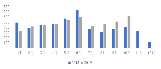 2018年初,一二線核心城市在政策的強調控下,成交量率先開始萎縮,一線城市和一些核心二線城市均出現不同的下降。2019年初,尤其是在2月份之後,這些城市的成交量開始回暖,我們認為這一階段一二線核心城市成交的回暖只是反彈,而不會形成長期的趨勢,成交難以反轉。然後在5、6月份之後,這類城市成交量同比逐步下滑,尤其是一線城市在8、9月份的成交量下滑嚴重。