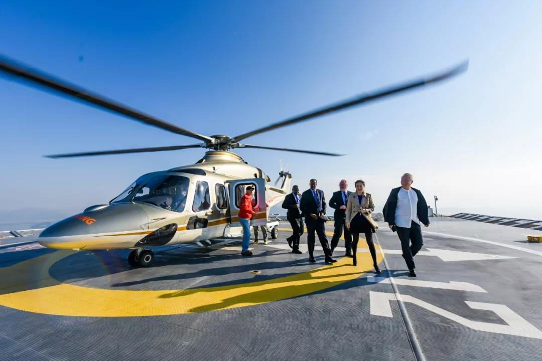 期間,鵬瑞集團董事局副主席郭東風先生、鵬瑞集團行銷管理中心總經理劉姍姍女士、深灣會總經理關雅萱女士、中美洲際副董事長諶羿妃女士、星雅航空董事長&總裁陳柏儒先生共同以華美金沙“點亮”直升機,標誌著深圳灣1號停機坪正式啟航。