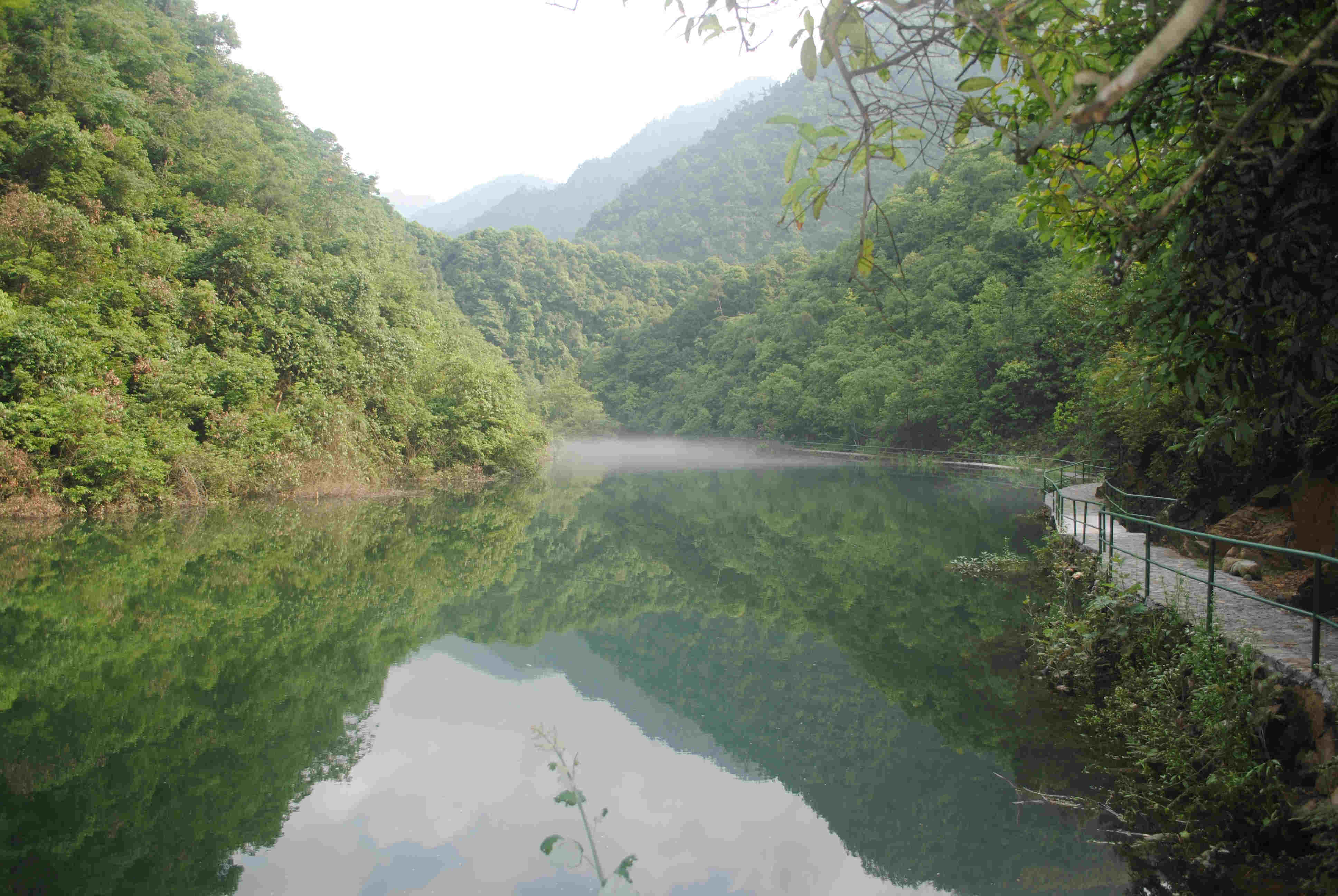 先乘景區內的電瓶車到平湖,近四公里。景區內濕度大,各種植物生長茂盛,一些樹的葉子金黃。河很窄,寬處也不過數米。水慢慢流著,許多嶙峋的石塊露出河床。