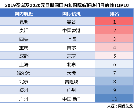 熱門目的地方面,“雙旦”期間國內航班熱門到港城市前十位依次為:昆明、貴陽、西安、重慶、成都、上海、哈爾濱、北京、鄭州、廣州。國際航班到港城市依次為:曼谷、中國香港、上海、首爾、東京、北京、大阪、吉隆玻、廣州、中國澳門。值得注意的是,“雙旦”期間的國際航班出現了出境和入境雙向客流高峰,除了香港和澳門外,上海、北京、廣州等國內城市都是較為熱門的國際航班目的地。