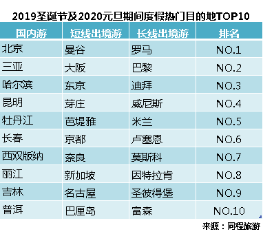 元旦沒有了“小長假”,選擇“拼假”的方式來完成國內長線游或出境游的遊客比例就相應增加了。《報告》來自同程旅遊的“雙旦”度假大資料顯示,與往年相比,今年元旦期間的出遊人群中選擇拼假出遊的國內長線游和出境遊的比例明顯上升,拼假方案以節前休假為主,一般為12月30日、31日兩天休假,出遊時長5天左右。熱門目的地方面,國內遊熱門目的地前十名依次為:北京、三亞、哈爾濱、昆明、牡丹江、長春、西雙版納、麗江、吉林、普洱。全國範圍內,雙旦期間東北三省的冰雪遊線路最受歡迎,前十大國內游目的地中東北占了四席,吉林霧凇、雪鄉、哈爾濱冰雪大世界、長白山等都是冰雪遊熱門“打卡地”。三亞依然是避寒遊的首選,除了常規的觀光線路,還有較為高端的旅居等新玩法。