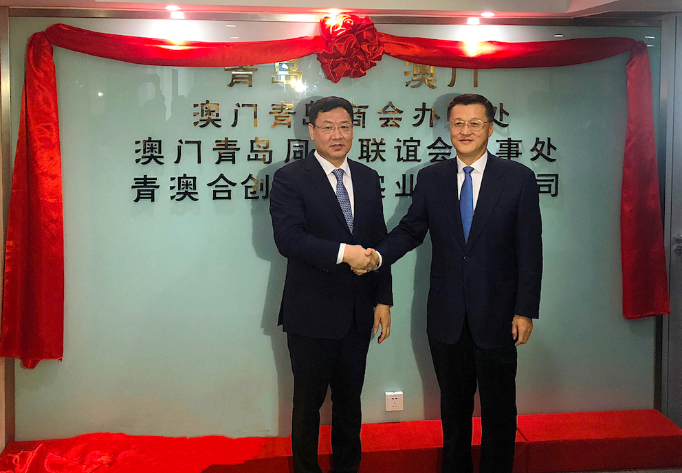 青島市政協主席楊軍(右)與澳門青島同鄉聯誼會會長張連慶為辦事處揭牌