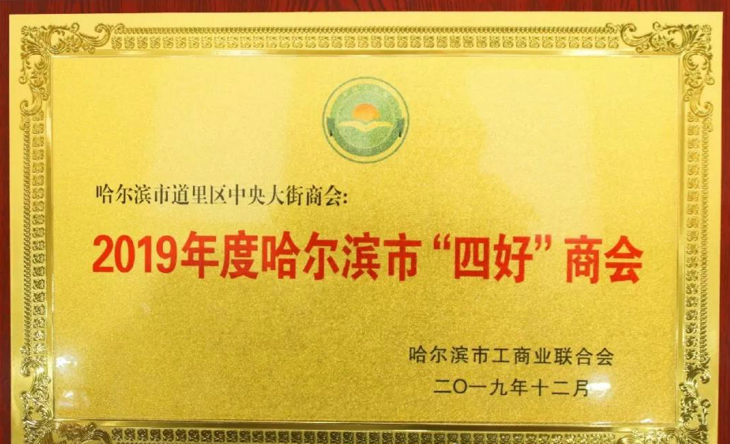 感謝哈爾濱市工商業聯合會、哈爾濱市總商會授予我會2019年度哈爾濱市「四好」商會稱號,中央大街商會將再接再厲,努力圍繞中心,創新發展,為會員搭平台、建橋樑、促經濟、謀發展,加強政府與企業、企業與企業、企業與消費者之間的溝通交流,務實高效開展商會各項活動,群策群力,大膽探索,共同為哈爾濱城市名片百年老街的文化建設和經濟發展做出更大更好的貢獻。