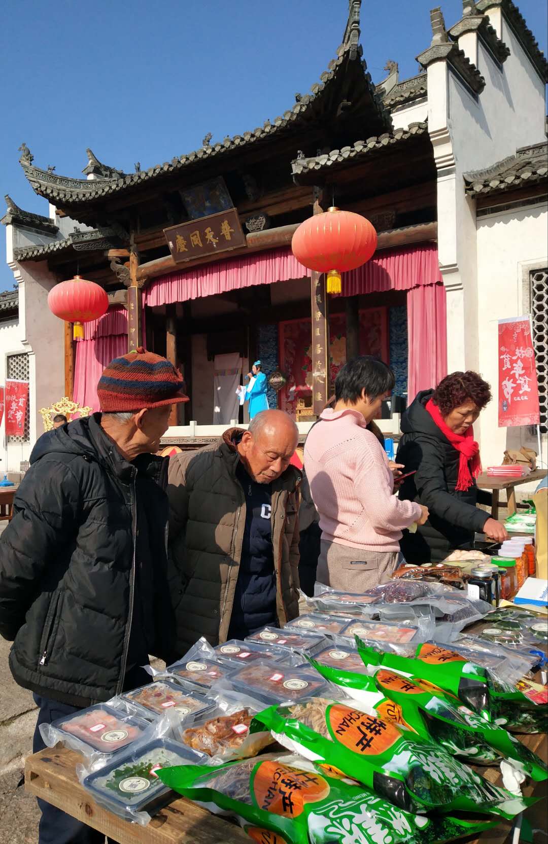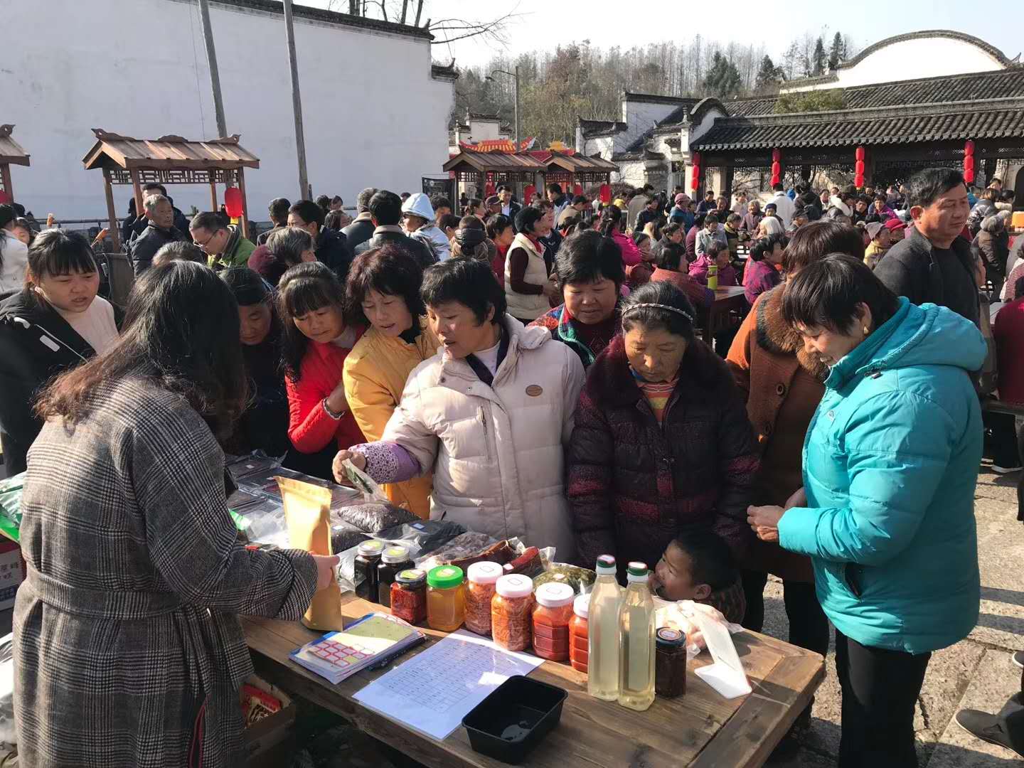秋意猶未盡,冬意已漸濃。當天秀裏古戲臺前,曲音回蕩,人頭攢動。茶葉、山貨、火腿、蜂蜜、宏潭豆腐乳、黟縣五黑系列特色產品、黟酒等來自黟縣的100多種特色年貨產品,琳琅滿目,為百姓和遊客送來新春的祝福。