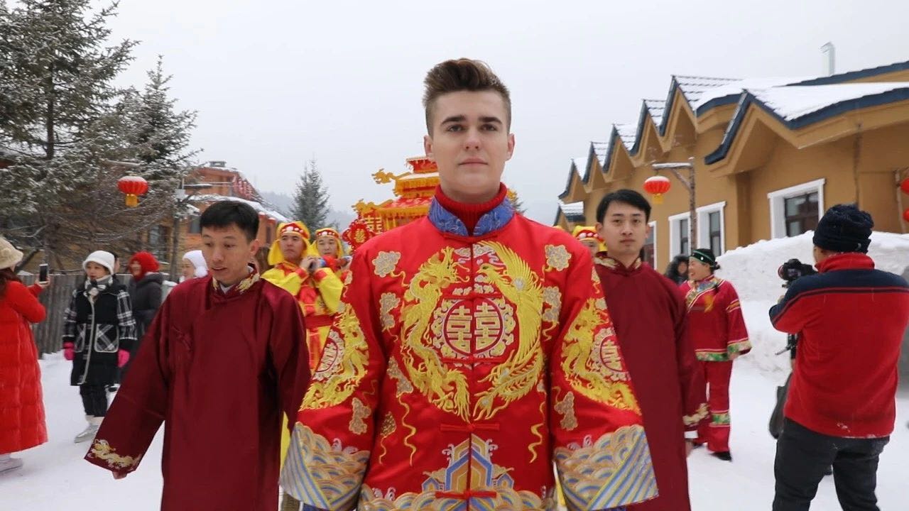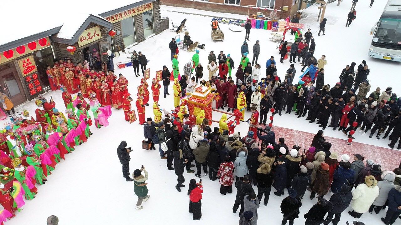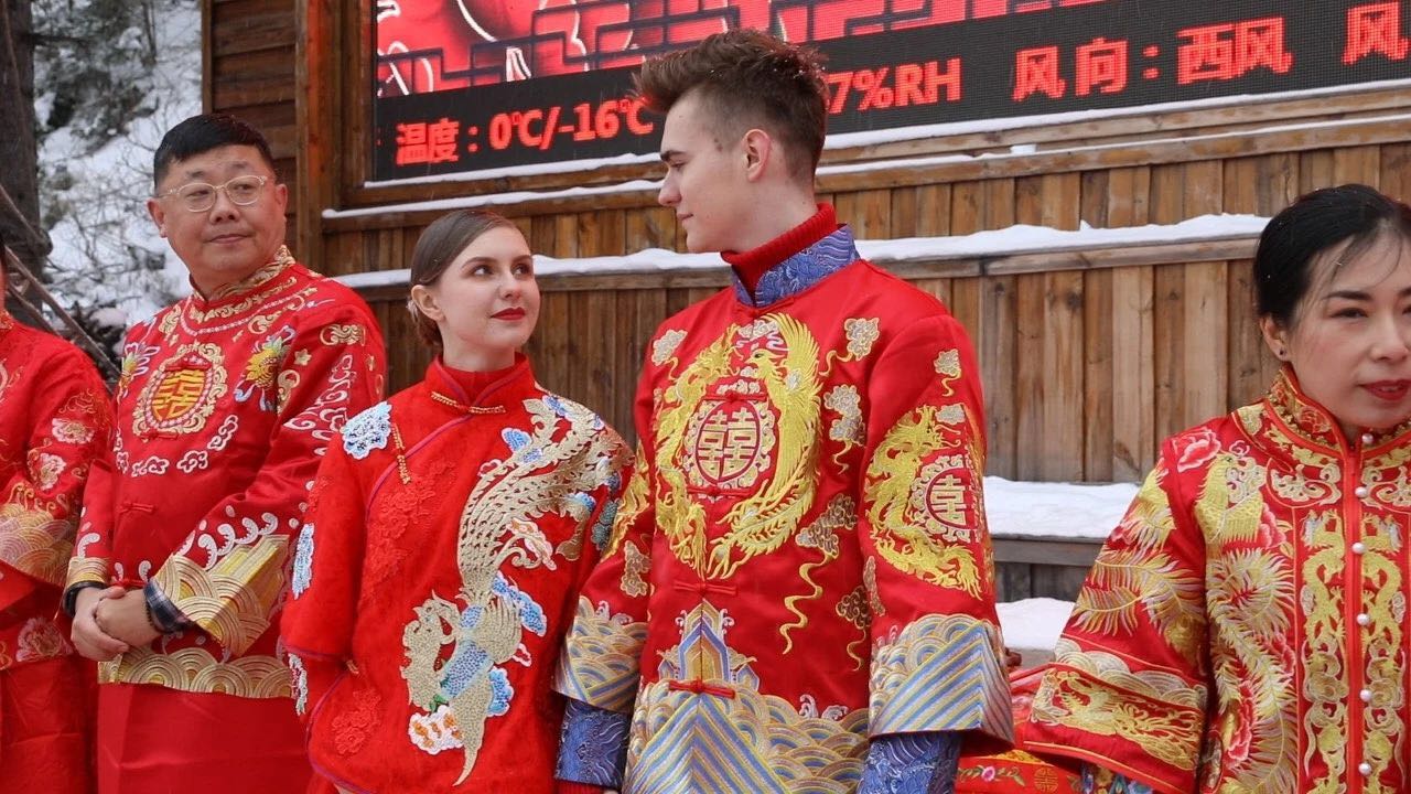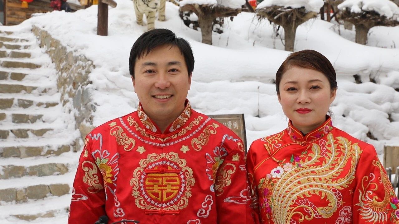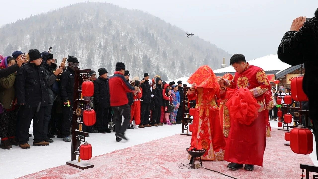 【香港商報網訊】在喜慶的鑼鼓聲中,10對新郎新娘身着中式禮服,牽着大紅綢,由冰雪童話世界中款款走來……12月9日上午,來自俄羅斯、上海、南京等國家和地區的10對「新人」,在黑龍江大海林林業局「中國雪鄉」景區舉行了傳統中式集體婚禮。