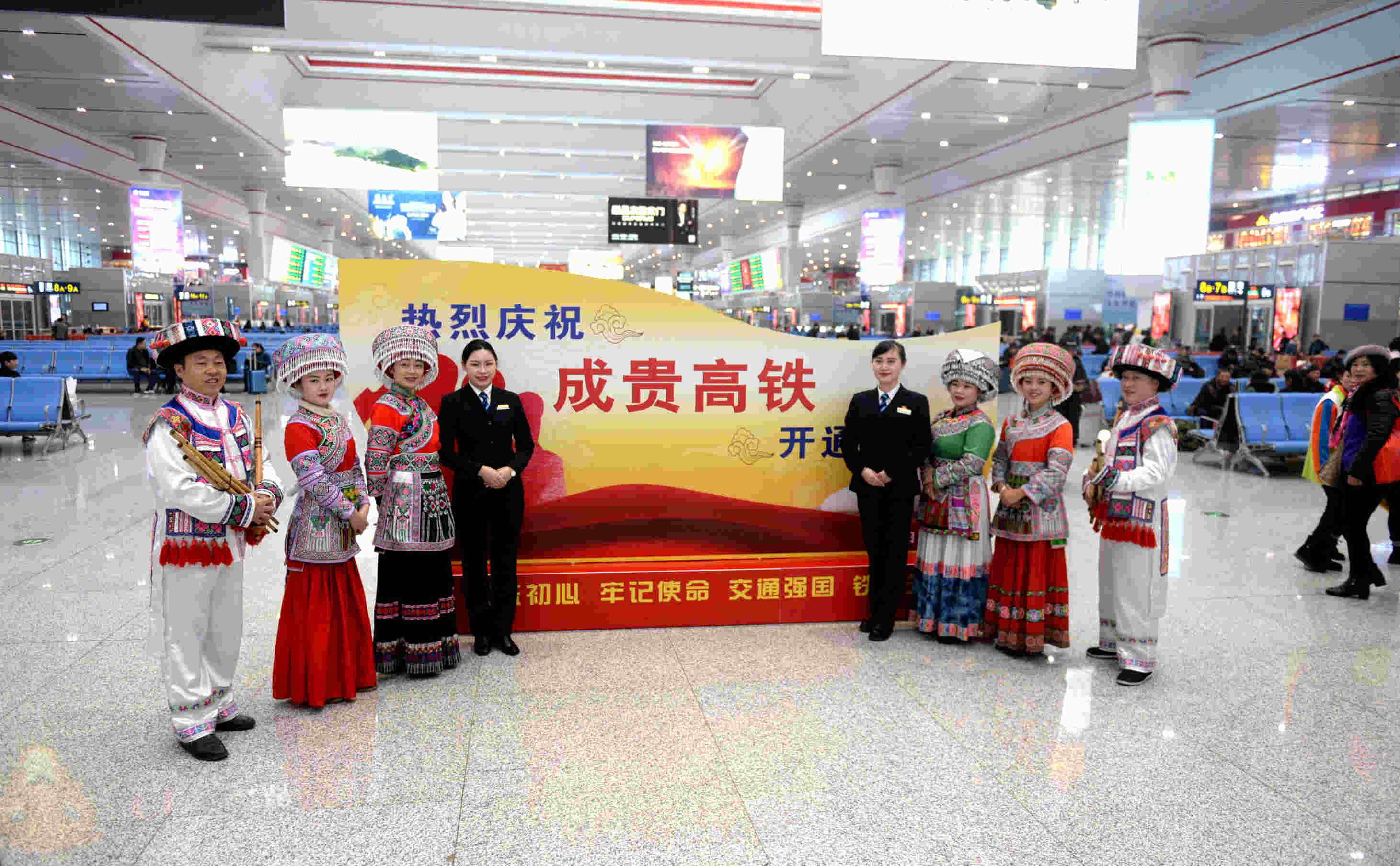 當天上午8點10分,彝族少數民族在站台唱敬酒歌迎接旅客,首發班組亮相吸引了所有乘客的目光。