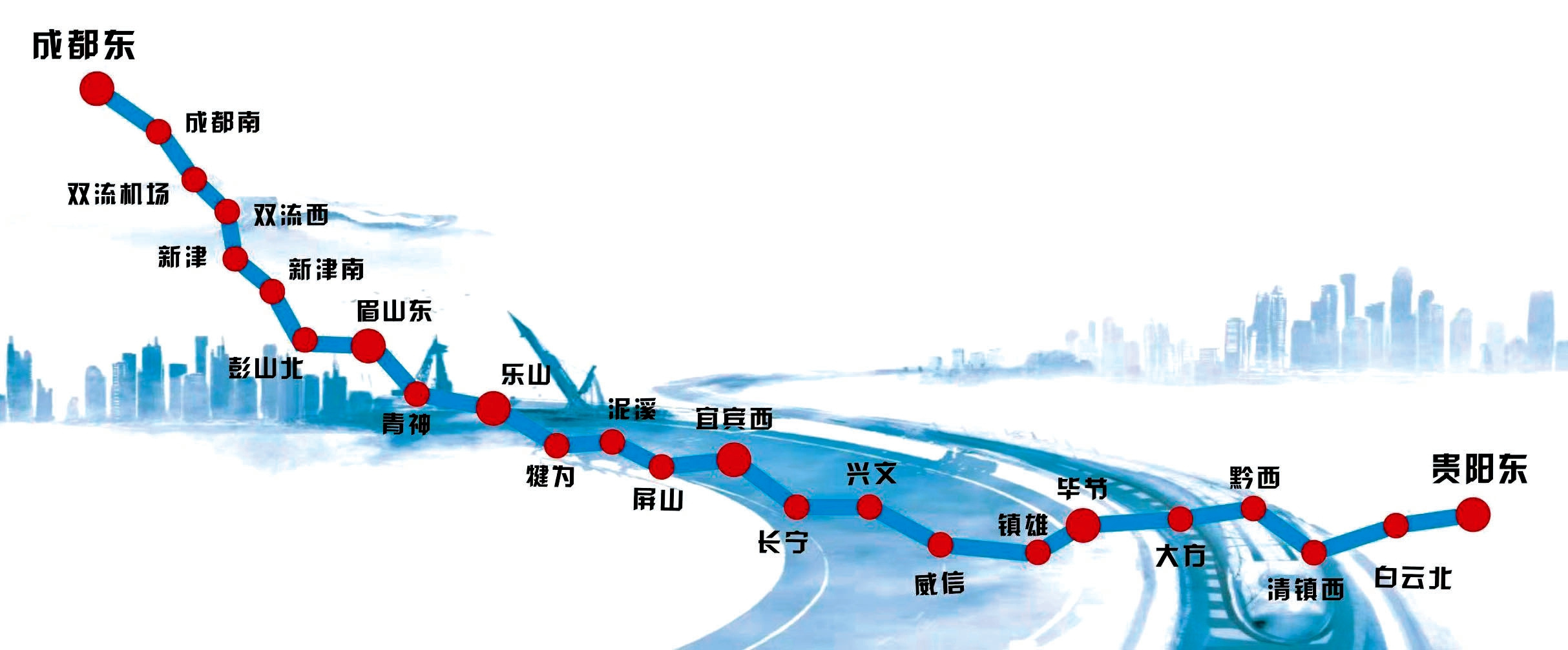 成貴高鐵起於成都市,途經眉山市、樂山市、宜賓市,雲南省昭通市,以及貴州省畢節市,終至貴陽市。線路全長648公里,設計時速250公里。成都至樂山段於2014年底開通運營,樂山至宜賓段於今年6月開通運營。宜賓境內設泥溪、屏山、宜賓西、長寧、興文等5個站點。