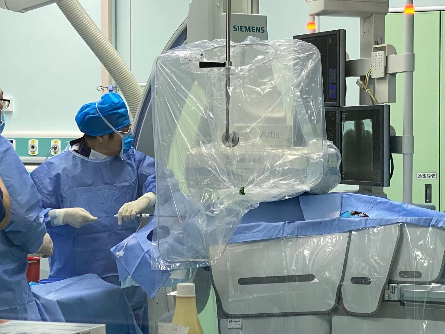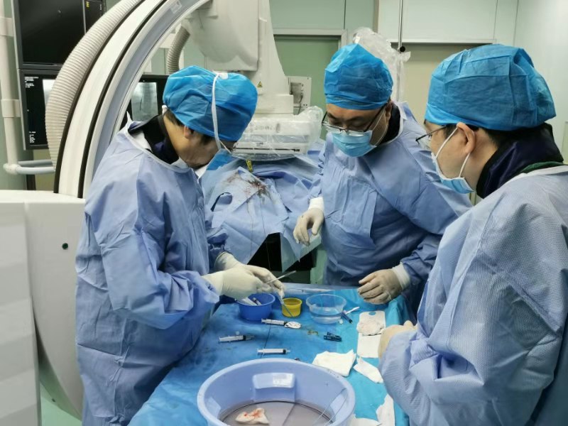 為了更好的為患者排憂解難,李肖主任白天完成北京總院的門診任務後,連夜飛至深圳。夜裡11點多趕到醫院介入手術室顧不得喝一口水,立即投入病人的救治,並與早已做好術前準備的介入科同道一起同台演義、合作手術,只為儘早為患者減輕痛苦。時間彷彿上緊了發條,在三位術者嫻熟的技藝和巧妙地配合下飛速流過……歷時近2個小時,手術順利完成,梁先生被安全送回病房慢慢休養。此時,整個手術室里的醫護技成員才慢慢輕鬆下來,與同伴們一起討論剛才手術中的精彩之處。而共同完成手術的三位醫生脫下鉛衣,只見他們的手術衣已全部被汗水打濕。