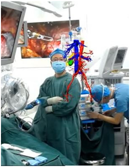 「東文教授非常重視術前規劃,此次他在深圳首次使用了原創專利技術——腹腔鏡腎臟手術個體化腎血管評價系統(SIREN 系統),通過手術前對患者的腎臟血管情況進行三維立體重建,不僅清晰顯示出了患者腎臟的動脈、靜脈血液供應情況,還可以預先對手術切除層面進行演示。」泌尿外科主任田軍教授說,藉助這項技術可對腎臟血管進行直觀、量化的評估,可以實現術前精細化的規劃,為複雜腎癌手術提供安全保障。
