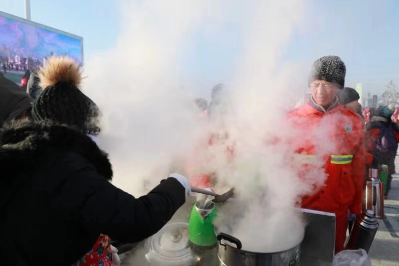 冬至這一天,神州北極漠河氣溫降至零下四十度左右。作為大興安嶺地區「萬人潑水成冰」的主會場,漠河市上千名市民和遊客相聚在冰雪戶外,支起鐵鍋、煮起水餃,吃過熱氣騰騰的東北水餃過後,大家紛紛拿起水杯、水瓢,舀起滾燙的「餃子湯」,在廣場上擺出一個大大的「北」字,隨着主持人一聲令下,大家同時將「餃子湯」用力潑向空中,一團團白霧騰空而起,隊伍上空瞬間出現一大片雲朵,場面氣勢恢宏,遠遠望去,十分壯觀。四川的遊客楊顯玉興奮的說,第一次跟這麼多人一起玩「潑水成冰」,而且潑的還不是水,是煮餃子的湯,潑出去以後能聽到熱水結冰的聲音,還能聞到餃子的香味,真是一種難忘的體驗,一點都沒玩夠呢。
