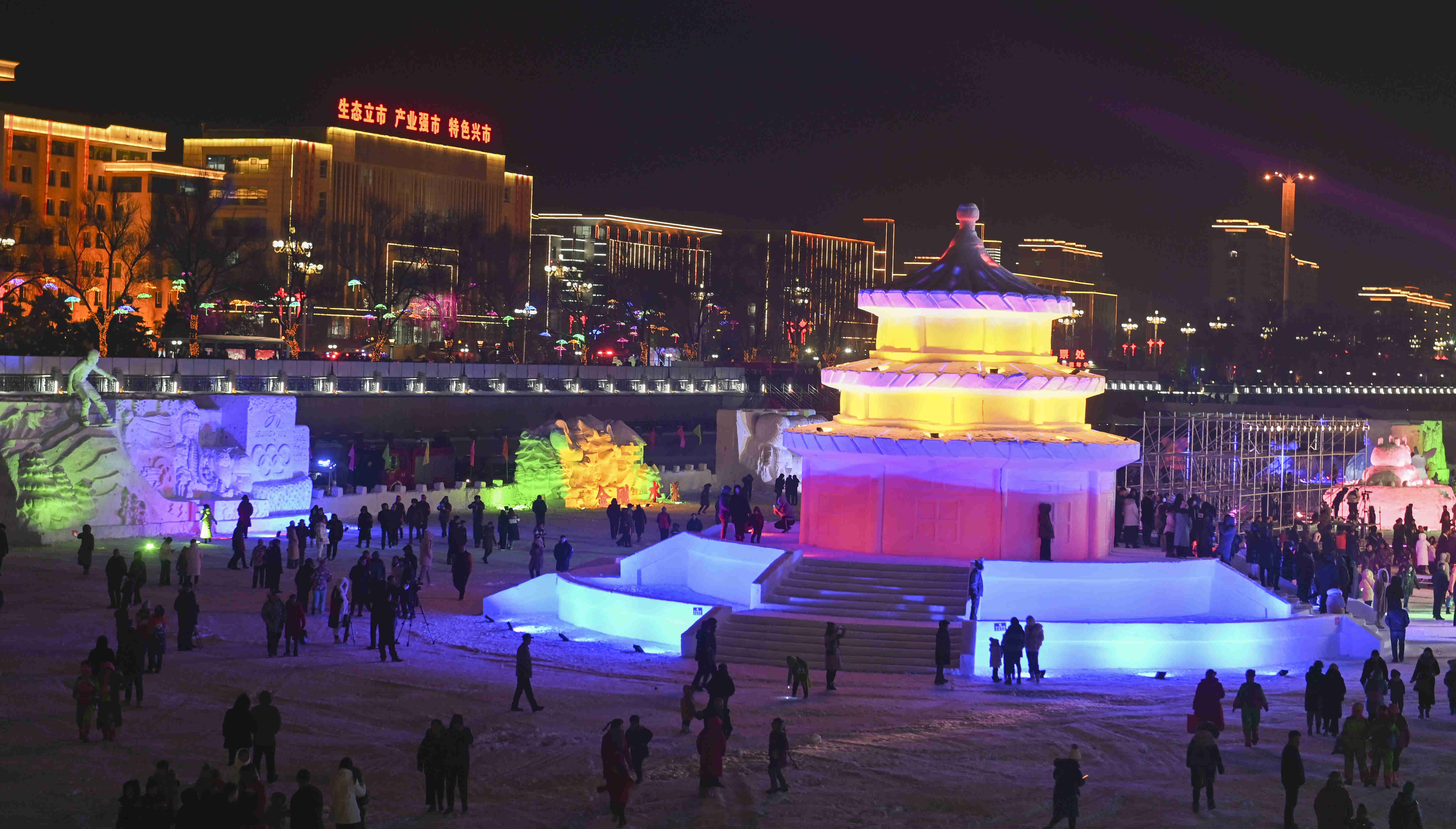 開幕式結束後,現場嘉賓和遊客開展了遊園活動。他們分別參觀了迎春燈會展區和桃花島,觀看了大馬戲表演,體驗了美食區項目和冰雪娛樂區項目。