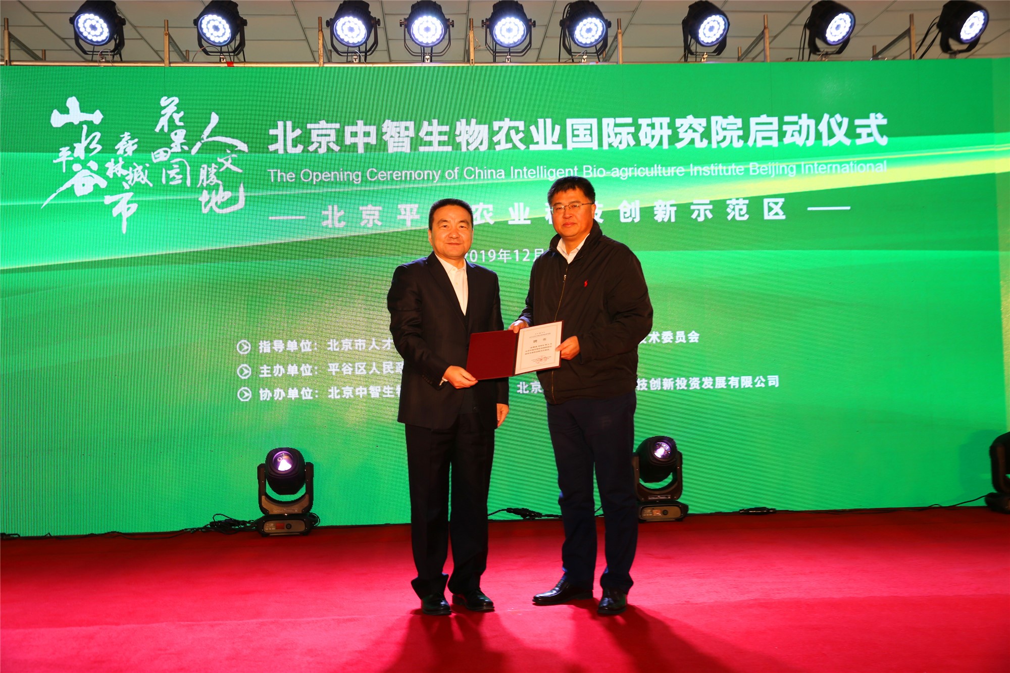 平谷區區委書記王成國(左一)為學術委員會副主任胡培松院士頒發聘書