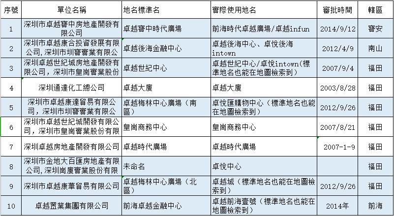 對於已經出現同名或者名字相似的商圈或寫字樓,特別是針對市民吐槽的建築物名稱問題,該局對反映最多的「卓越」系列名稱進行了初步排查,並就實際使用地名與該局審批的標準地名進行了比對。經核查,除卓越大廈、皇崗商務中心、卓越時代廣場使用了標準地名外,網上提及的「卓越」系列的地名均為企業自行制定的推廣名,未使用標準地名,比如卓悅匯、卓悅intown、卓悅後海intown等。另外,位於福田中心區的「卓悅中心」尚未向申請建築物命名,使用的也是推廣名。