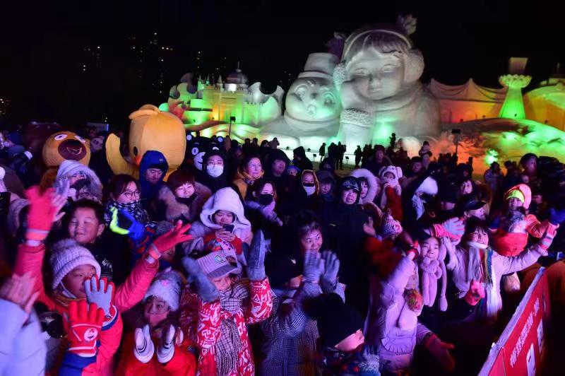 開園儀式上,歌舞表演精彩紛呈、腰鼓樂隊鼓聲震天。絢爛的煙花在高空中綻放,點燃了現場的火爆氣氛。可愛的玩偶們隨着音樂翩翩起舞,歡迎着市民及各地的朋友來到牡丹江、走進雪堡。
