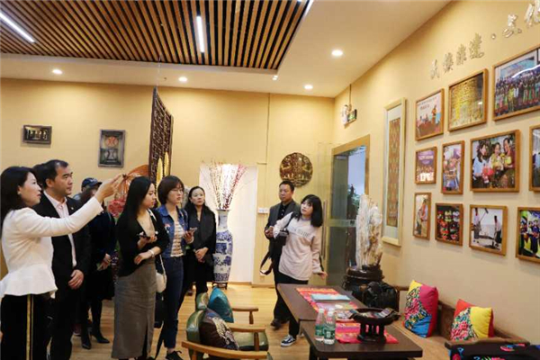 在“晚象民族非遺館”,公司創始人孔麗向袁泉處長及媒體代表等一行介紹了民族非遺館主要收藏和展示的各族傳統非遺手工藝品、民族服飾、生產工具、樂器、文獻、民族圖騰等,重點介紹公司近年來致力於搶救的傣族非遺織錦項目以及公司在傣族歷史文化研究及非遺專案挖掘上的工作,其中具有3000年歷史記憶的國家級非物質文化遺產傣族織錦是公司文創研發的核心,通過自主創新研發的晚象文創是具有中國民族特色,融合中華傳統文化及傣族非遺特點的系列衍生品;董事長孔麗現場接受國家民委《中國民族雜誌》記者的採訪。