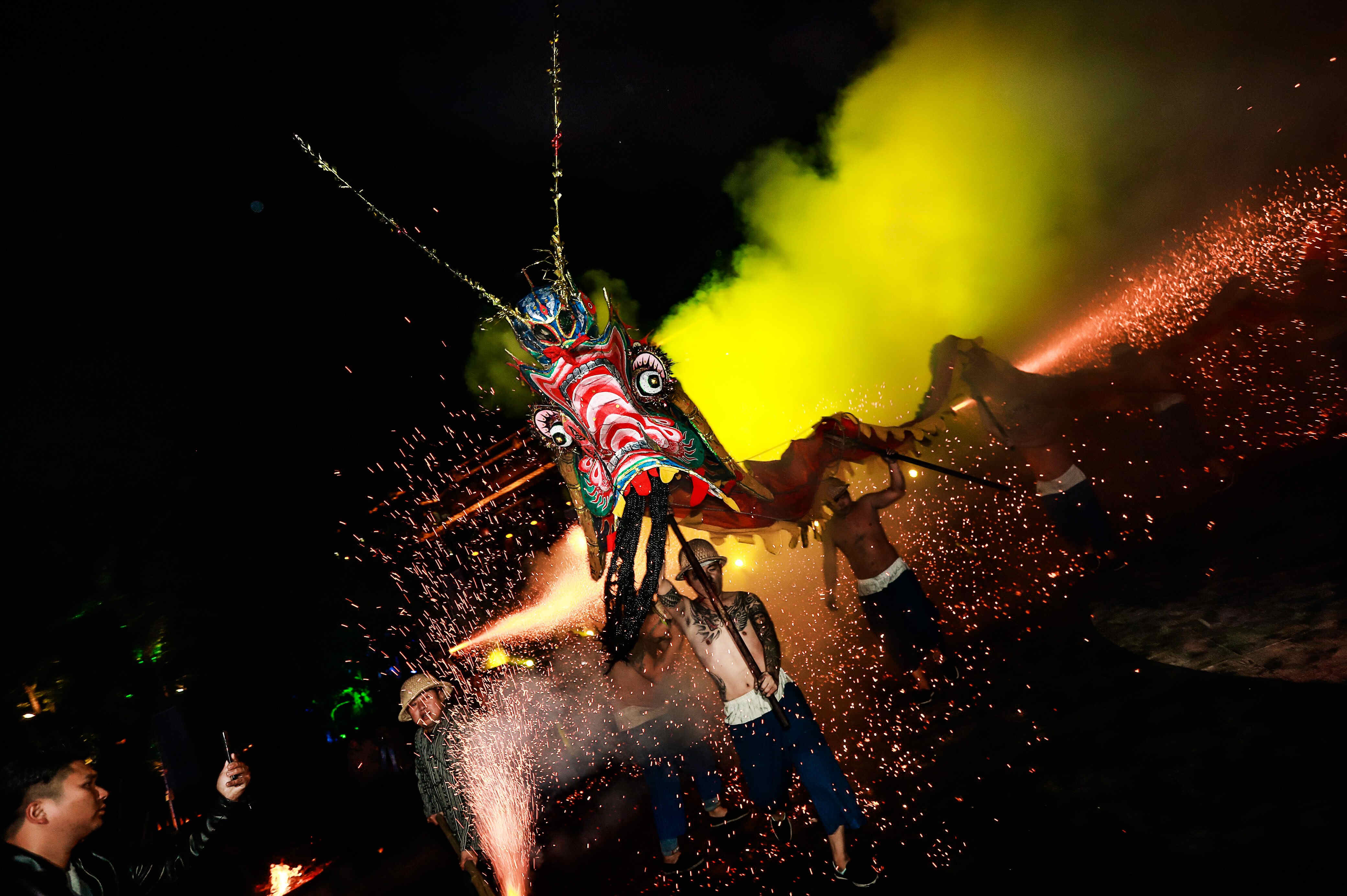 夜幕下,數十個漢子揮舞著一條威猛的祥龍翻雲騰霧,鋼火師接連點燃鋼火竹筒,橘紅色的鋼花齊刷刷朝著龍身飛瀉,精彩的“鋼火燒龍”儀式和《花開芙蓉·畢茲卡的狂歡》系列節目陸續上演。硝煙與火光中,龍身若隱若現,穿梭來往,仿佛下一刻就會趁勢而起沖上雲霄。鋼火映照下,漢子們擎著火龍揮舞奔跑,野性的吼叫震耳欲聾,仿佛江河在咆哮;土家少女婀娜的身姿與土家漢子雄渾的戰舞,展現著湘西非遺的唯美與神秘…在現場熱烈的氣氛中,迎來了雪鷹火龍絕學在湘西的完美落地。