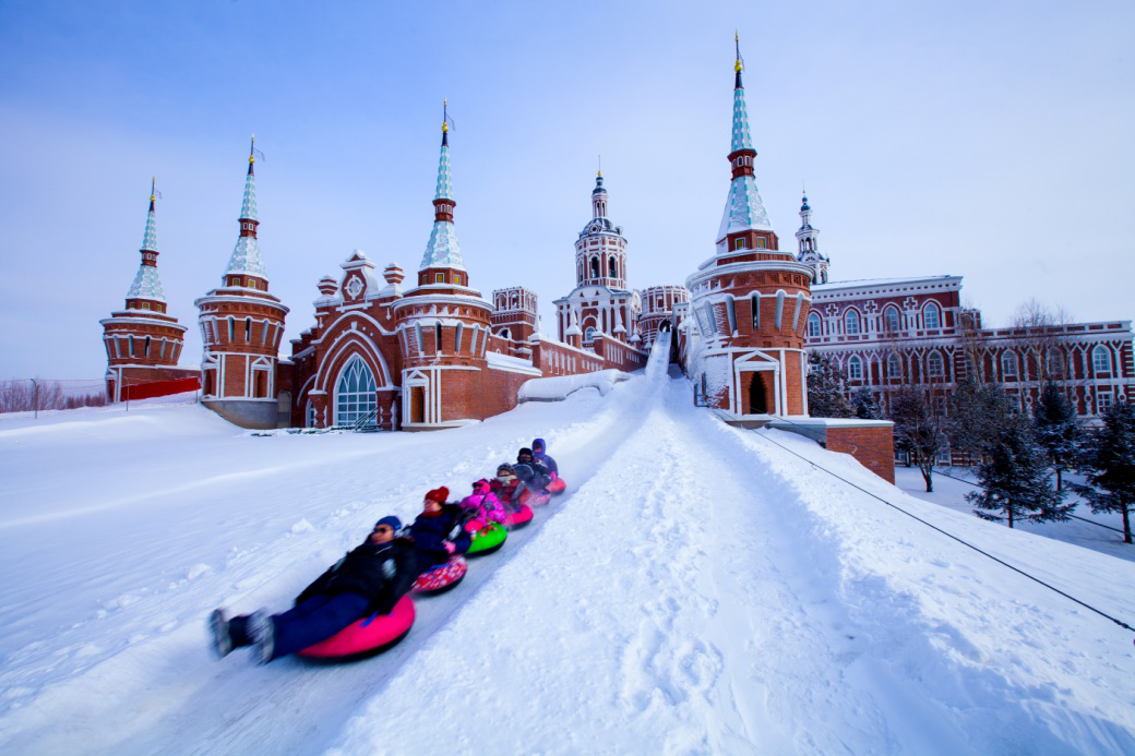 滑行穿過彼得門,伏特加酒堡映入眼帘,這座建築原型為俄羅斯「畢普」城堡,是俄歷史上著名的古堡,是中國首個伏特加酒為主題的城堡。酒堡用特製的冰酒杯盛飲伏特加,提杯一飲而盡,手涼心熱、冰封至燃燒的體驗,終生難忘……