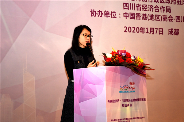 香港特別行政區政府駐成都辦主任李蘊妍在致辭時說,此次專題講座的內容主要基於自2020年1月1日起正式實施的《中華人民共和國外商投資法》和《香港澳門台灣居民在內地(大陸)參加社會保險暫行辦法》,不少在川港企和在川工作生活的香港人仍對新實施的法律法規和政策不甚了解,希望能夠為他們進行科普、釋疑,此次講座邀請了來自國際知名會計師事務所、律師事務所的業界專家,可以幫助在川港企了解和掌握《中華人民共和國外商投資法》的具體內容、如何優化增值稅管理、香港員工在內地繳納社會保險和住房公積金的規範與實操等信息。