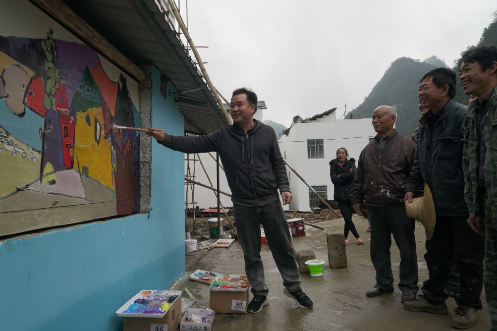 在大莫村,大芬畫家與靖西農民畫家進行了座談交流,同時對當地農民畫家進行了繪畫培訓,隨後大芬畫家詳細了解了大莫村的傳統文化特色,在大莫村弄關屯每年春節期間都會舉辦鬥牛、鬥雞活動,吸引千名遊客前來觀看,為牆繪創作內容提供了靈感。培訓結束後,大芬畫家與靖西農民畫畫家一同對大莫村鬥牛場旁村民房外牆進行繪製,從苗族、壯族、邊關的地域特徵和文化特徵上挖掘創作資源,以藝術介入的方式促進了邊境文化資源的保護和發展,藝術與鄉村的共融共生,讓文化發展的成果最大限度地惠及邊境地區人民。