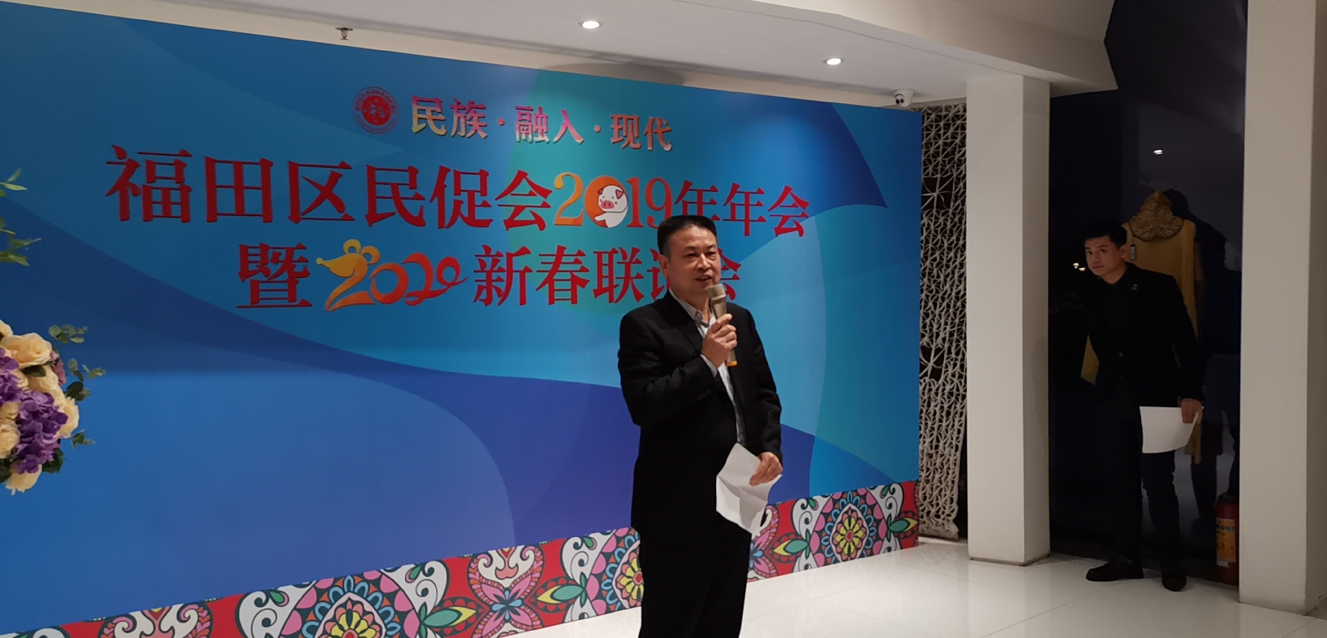 朱亞銘在致辭中代表福田區委統戰部(民宗局)向全區各民族同胞致以新春的問候,並和大家分享了在各民族同胞的共同參與和努力下,福田區民族工作取得的令人滿意的成績。過去2019年,是極不平凡的一年,是新中國成立70周年,深圳建市40周年,也是福田區民族工作取得長足進步的收穫之年,我們“互聯網+民族團結”行動等經驗和圖片被民族畫報等中央級報刊多次報導。福田區民促會充分發揮自身優勢,傾心耕耘民族團結進步事業,多次組織進社區活動,通過法律諮詢服務、困難幫扶關愛、宣傳培訓引導、就業創業指引、文藝匯演,以及民族文化進社區、進校園、進企業等方式,為來自全國各地的少數民族同胞提供了豐富多彩的幫助和服務,營造了各民族同胞交流交往交融的良好局面。特別是創新實施的“和風送暖?法潤福田——福田區涉及少數民族矛盾糾紛調解與處理”項目,成績突出,全年共處理了24宗少數民族法律援助案件,有效化解了涉及少數民族因素的矛盾糾紛,促進了民族團結社會和諧。