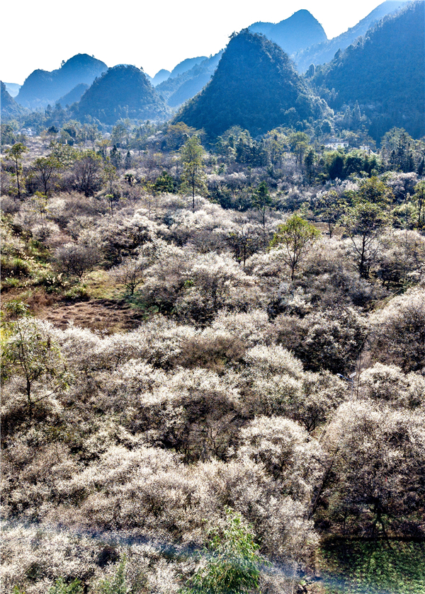 據悉,荔波萬畝梅原景區位於黎明關水族鄉洞塘,這裡天然生長着兩萬多畝野生梅花,樹齡在200年以上的珍稀古梅不下數百棵,是全國最大的集中連片的野生梅林,素有"十里梅海、萬畝梅林"之稱,每年元月中旬,這些梅花便會競相開放,花期長達1個多月。(黃慶松)