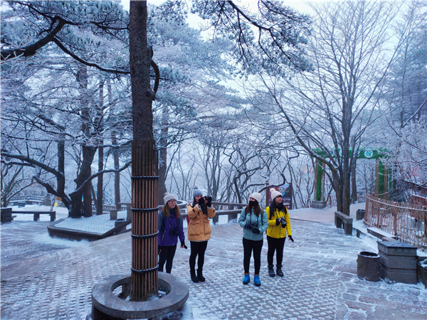 這場小雪的到來,給來山遊客帶來了不少驚喜,他們紛紛用手機、相機拍照留念,臉上洋溢著節日臨近的喜悅。