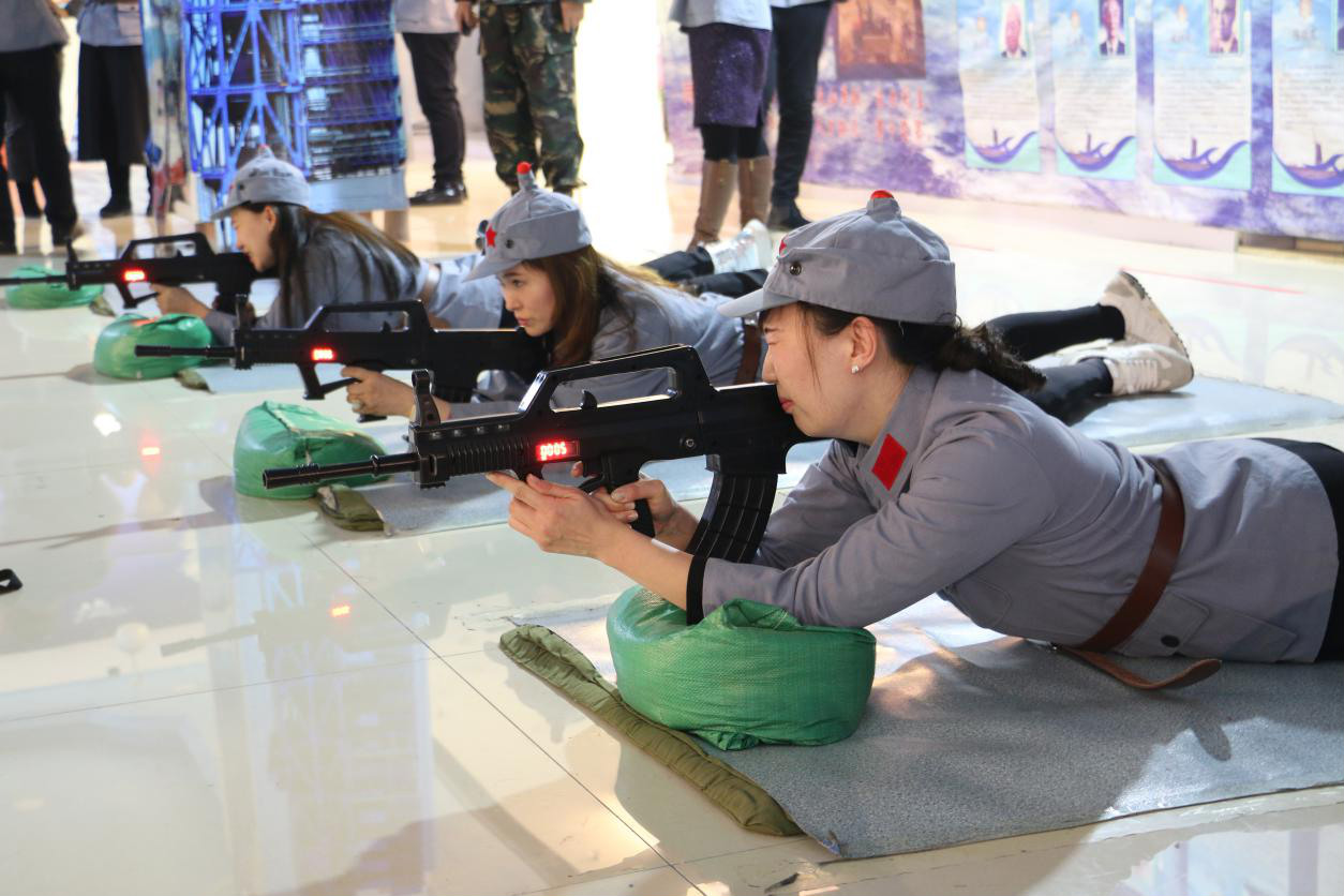 在國防教育館,與會人員體驗95式自動步槍激光靶射擊 劉嘉麗/攝