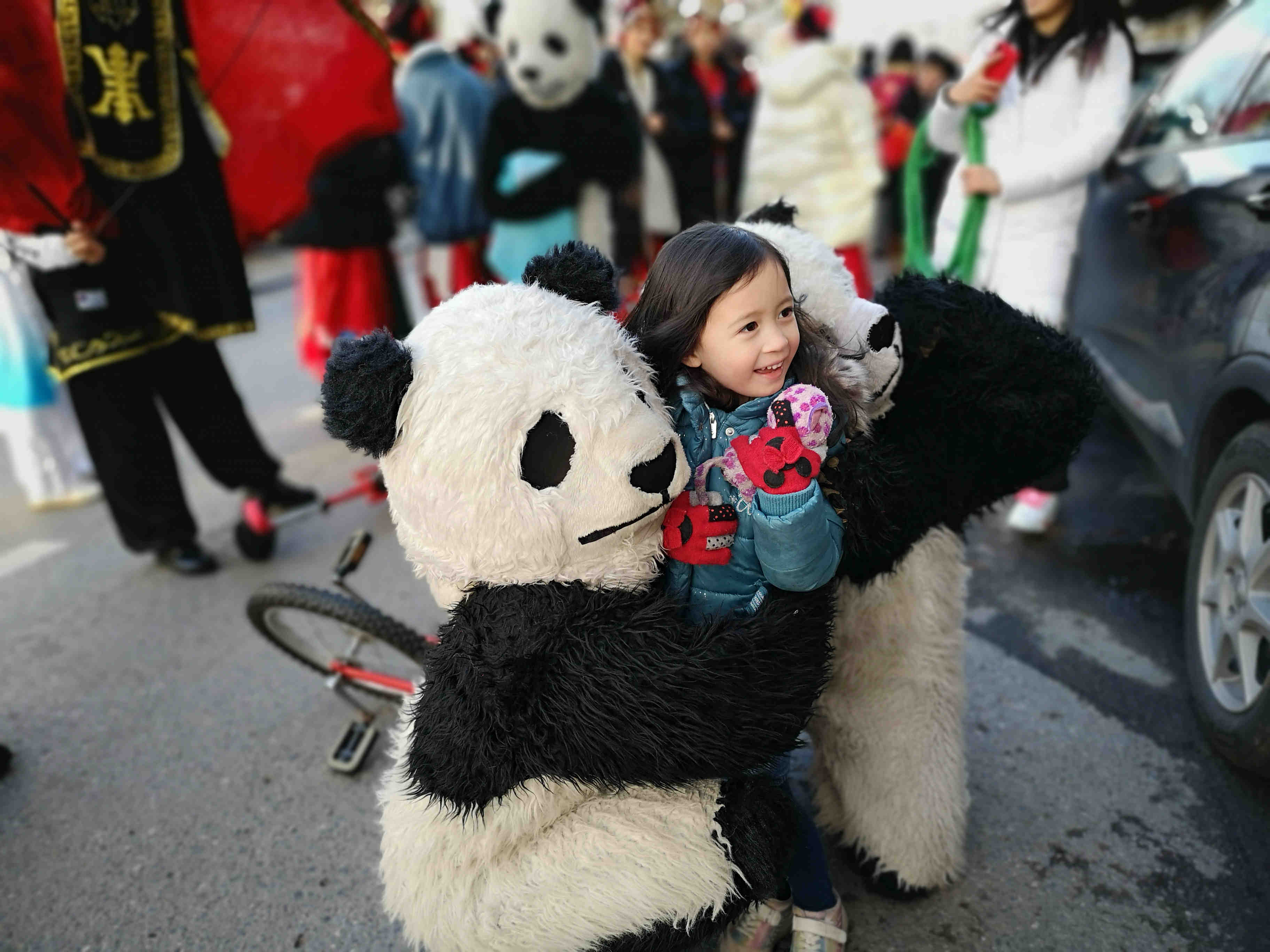 在2020年「歡樂春節」盛裝巡遊上,比利時小朋友和熊貓雜技演員合影