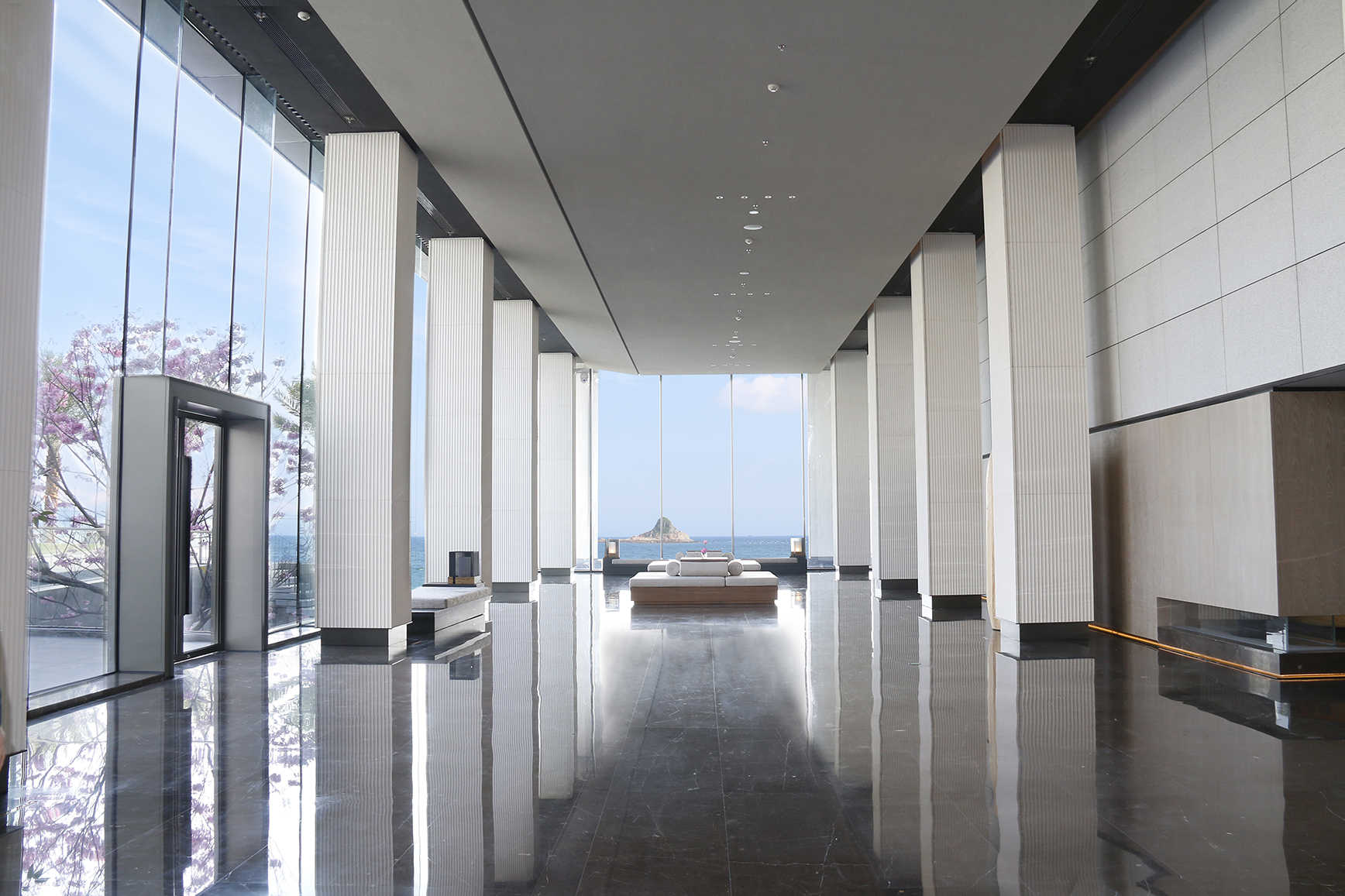 洲際行政俱樂部依主樓而建,秉持着「城市與自然對話,院邸與海洋交融」的理念,以水為本源,采精緻純凈的山石與水木構造出一座海濱水晶宮殿。大堂亦以憩水之城為主題,大面積運用透明落地裝飾,與海天麗景熱情相擁。