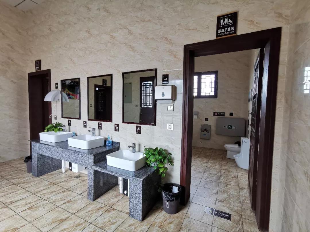 在田錫水景公園,這裡的公廁以木結構加小青瓦為主,整體為中式復古風格,與周邊的環境相映襯,完美融入了水景公園中。除了與公園環境相映生輝的外觀,內部細節也頗具匠心。乾淨整潔,配套齊全,仿古燈具、木質門窗......營造出古色古香的氛圍,更能讓遊人體會到貼心,舒心。