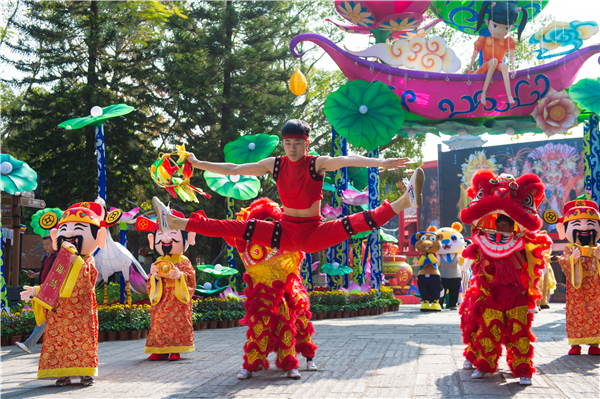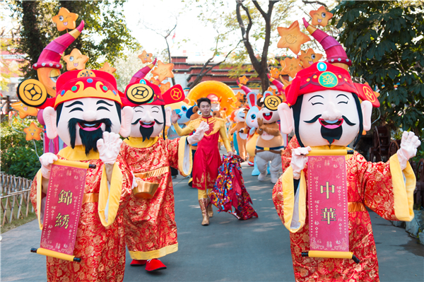 景區內年味兒正濃,燈籠、對聯、窗花掛滿園,雛菊、月季、蝴蝶蘭等百花齊放,滿園春意盎然。當然,最精彩的莫過於逛廟會!大年初一到初六,錦繡中華春節大廟會即將承包全家人的歡樂賀歲。相聲、快板、評書妙趣橫生;京劇、雙簧輪番上演,近距離體驗國粹文化。點獅成金,好運連連,景區攜手非遺舞獅團,將帶給遊客最精彩的梅花樁舞獅表演。一支由財神送寶、十二生肖、雜技戲耍、京劇舞團等十幾組獨具年味特色方隊組成的「庚鼠大巡遊」隊伍,也爭相給遊客送上新春祝福!