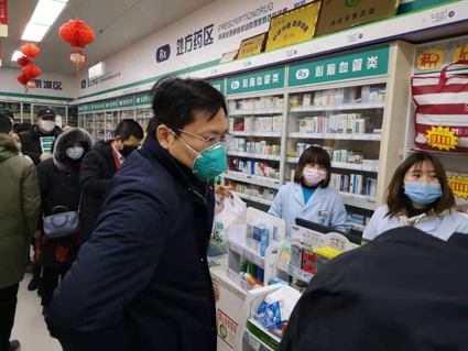 同時檢查了千金葯業廬山店,指出該店紅外測溫儀未使用、個別人員未戴口罩等問題,看到人們排着長隊有序購買口罩等防疫用品,對該店的保供穩價工作表示滿意。