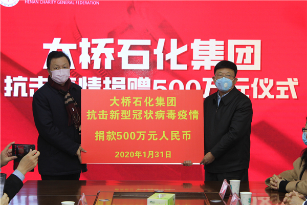 【香港商報網訊】記者 王皓萍 報導:為助力打贏這場疫情防控阻擊戰,1月31日上午,大橋石化集團抗擊疫情500萬元捐贈儀式在河南省慈善總會舉行。