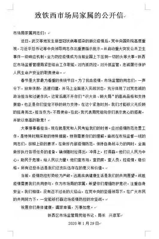 鐵西區市場局局長興彥軍在1月29日晚間,通過微信工作群發了一封《致鐵西市場局家屬的公開信》,請工作人員轉給家屬。信中表達出全局上下眾志成城戰勝疫情的信心與決心,同時,堅強的話語背後也透露着對家屬們的感激與愧疚。