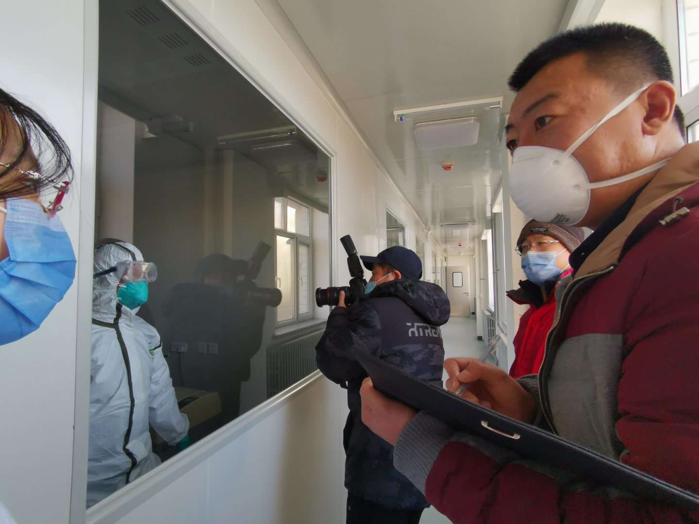 此時,記者所處的位置和實驗室隔着兩層玻璃和一個通道。向他們問候,卻根本聽不清裏面的人說了什麼。為了讓市民通過我們的採訪了解到實驗人員的工作狀態,展現他們衝鋒抗疫的決心,經領導特批,記者進入了通道,與他們只有一層玻璃之隔。通道一米多寬,每個角落都用白色膠條密封。透過方形玻璃窗,實驗室一目了然。實驗室由七八個小屋相連,每個屋子不大,裏面擺放着各種檢測儀器,三人站裏面就顯得很擁擠了。屋與屋之間通過傳離窗相連。三名工作人員趙振、周唯、張春苗,正透過防護眼鏡或隔離罩做着實驗。