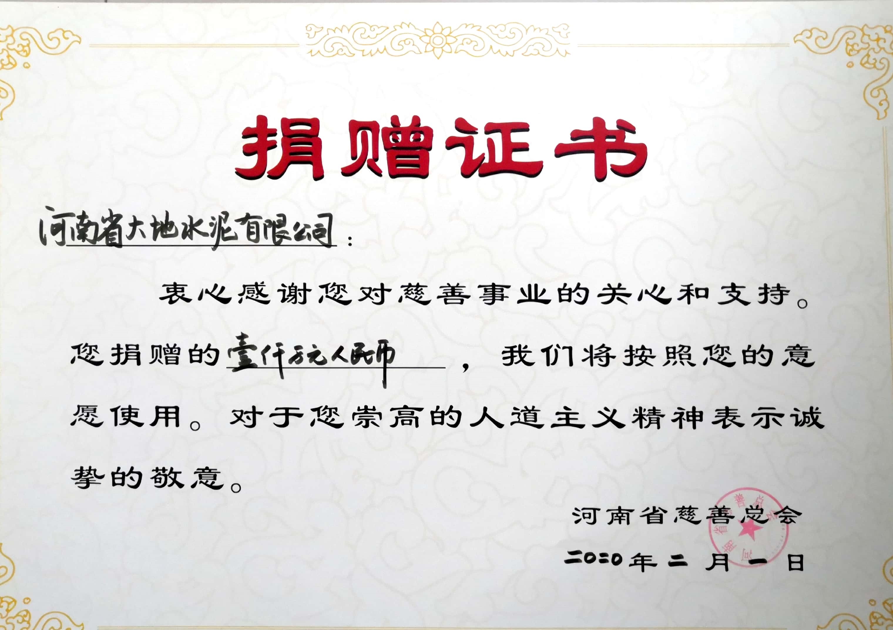 【香港商報網訊】記者 王皓萍 報導:力齊心協力,防控疫情。2月1日,河南省大地水泥集團於向河南省慈善總會定向捐贈1000萬元,用於平頂山市以及寶豐縣的疫情防控工作。